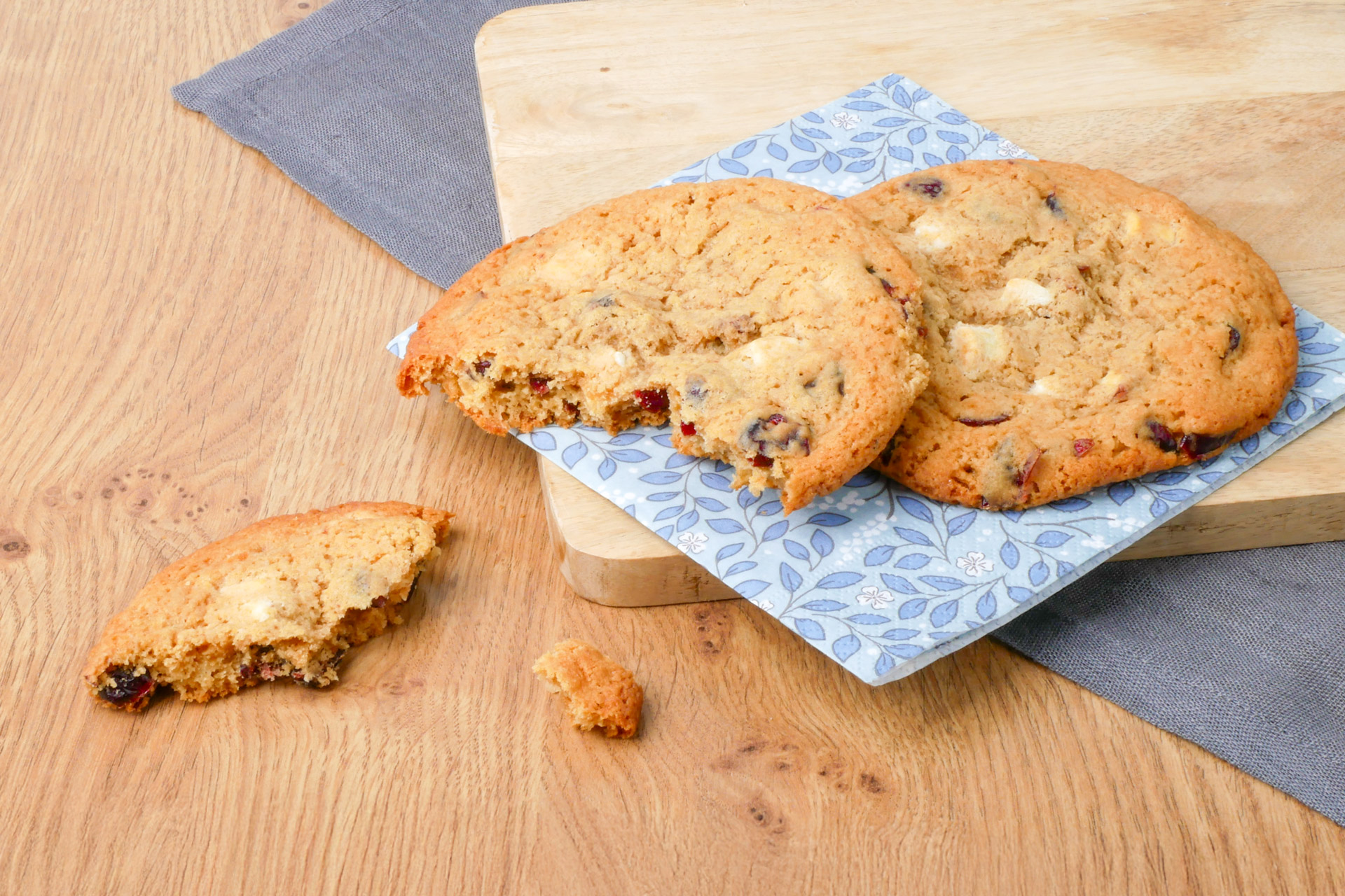 Cookie mit softem Kern, hellen Schokostückchen und Cranberries.