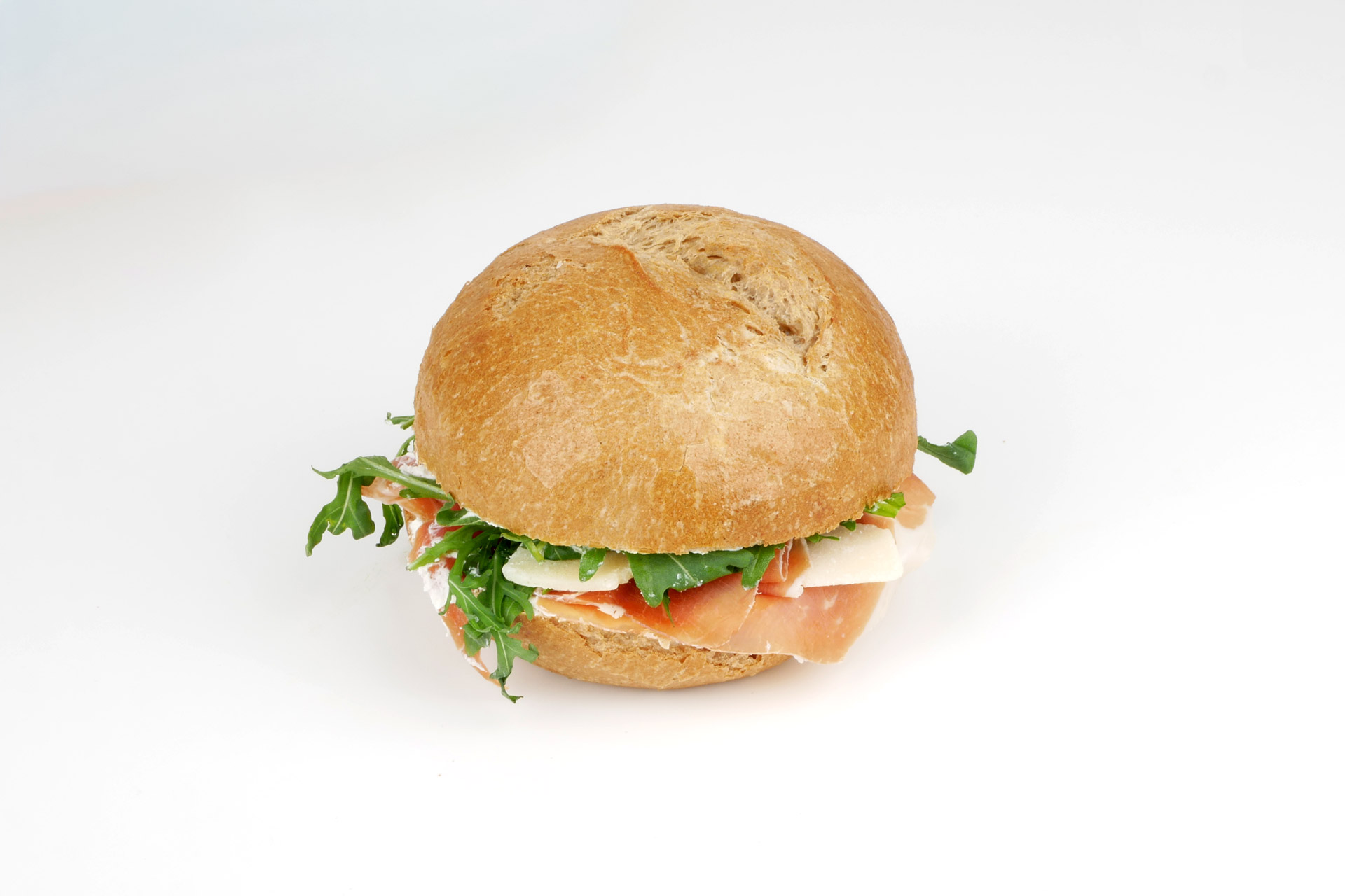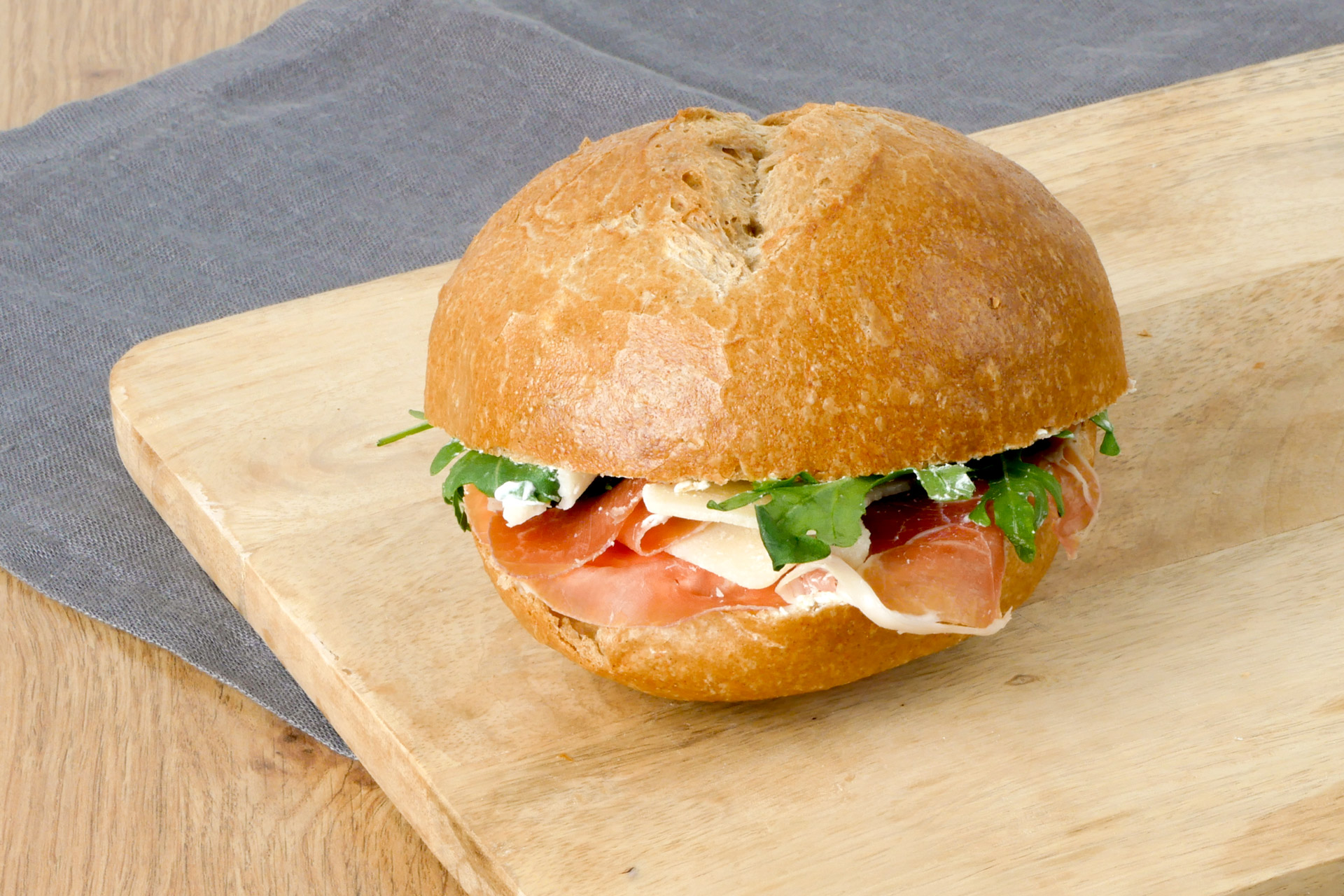 Herzhaftes Bauernbrötchen belegt mit Serranoschinken, italienischem Hartkäse und Ruccola.